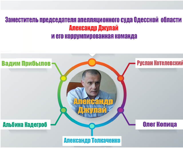 В апелляционном суде Одесской области заместителем председателя суда работает Александр Джулай, который по сути является «бароном», только не цыганским «бароном», а судебным «бароном», под руководством и контролем которого судьи уголовной коллегии Руслан Котелевский, Альбина Кадегроб, Олег Копица, Вадим Прибылов, Александр Толкаченко фактически открыто продают «нужные» решения по уголовным делам.