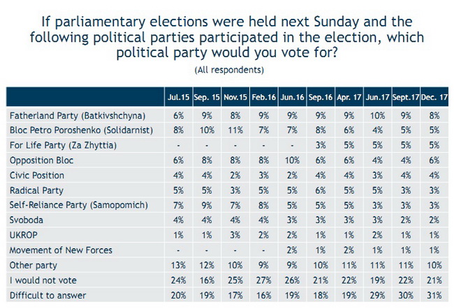 Все опросы политических симпатий и антипатий украинцев демонстрируют весьма неутешительную картину падения рейтинга партий и отдельных кандидатов. Особенно мрачным выглядит опрос, который проводила в конце 2017 года компания GfK Ukraine по заказу Американского агентства международного развития (USAID). Мрачным и особенно тревожным: в отличие от украинских социологов и политологов, американским не нужно «накручивать» рейтинги того или иного кандидата, они делают опрос для себя.