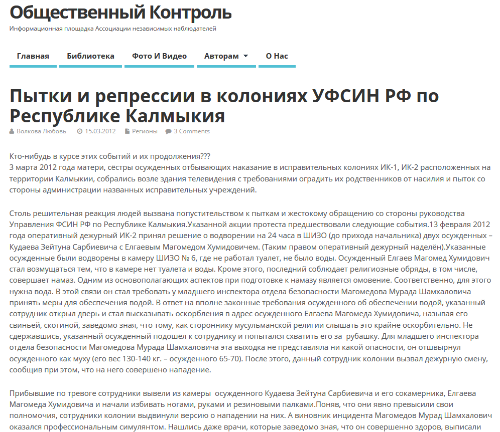 «2 марта 2012 года в ИК-2 (с. Яшкуль) произошла расправа над осужденными, которые содержатся в штрафном изоляторе (ШИЗО). Оперуполномоченный Отаев Евгений, находясь в состоянии алкогольного опьянения, пришёл в здание ШИЗО вместе с сотрудниками спецподразделения и стал требовать от осужденных выходить в коридор для проведения обыска. Осужденные стали правомерно возмущаться, поскольку это происходило ночью, после отбоя. Собственно на это видимо и рассчитывал Отаев. Осужденных по одному вытаскивали в коридор бойцы спецназа и вместе с Отаевым избивали. После того как расправа перешла в активную фазу, осужденные, не имея возможности противостоять такому произволу, стали резать себе вены».