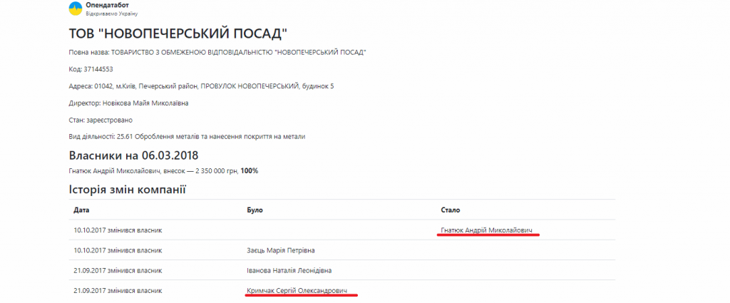 Пока НАБУ завершало расследование, а Крымчак вышел из СИЗО, последний стал прятать активы подальше от следователей. Так, еще 15 сентября Соломенский райсуд Киева арестовал принадлежащие Крымчаку активы (например, контрольные доли в упомянутом выше «Тандеме» и юрцентре «Правозащитник»), в том числе 100% долю в ООО «Новопечерский посад». Этой компании летом 2017 года, то есть когда уголовное производство, в котором фигурирует фамилия Крымчака, было в самом разгаре, Киевсовет выделил в аренду на 20 лет земельный участок площадью 1,6084 га на ул. Иоанна Павла II (бывшая ул. Патриса Лумумбы), 5. Однако незадолго до ареста активов, который не снят до сих пор, Крымчак продал 100% долю в капитале ООО «Новопечерский посад» некоей Наталье Ивановой, которая перепродала его Марине Заяц. А уже от нее пакет перешел к малоизвестному жителю Киева Андрею Гнатюку.