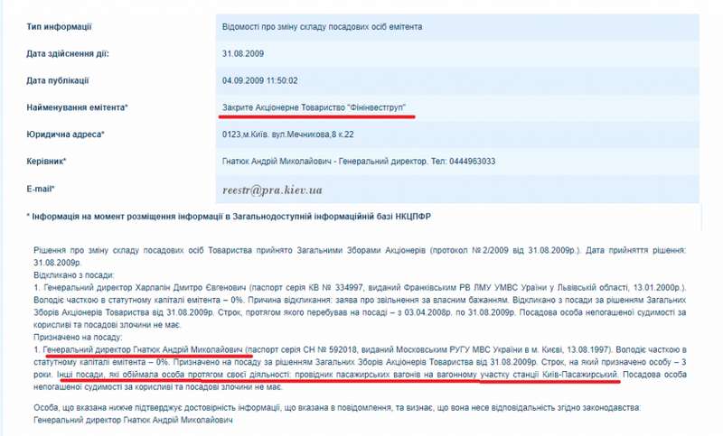 Как выяснил «ОЛИГАРХ», указанный Андрей Гнатюк в 2009 г. был назначен директором киевской компании «Фининвестгрупп» (акционер созданного ранее Киевсоветом холдинга «Хлеб Киева», которому были переданы пакеты «Киевхлеба» и «Киевмлына») после того, как ее выкупили у Василия Хмельницкого структуры из орбиты тогдашнего зятя Черновецкого Вячеслава Супруненко. До этого карьерного скачка Гнатюк работал скромным проводником пассажирских вагонов на вагонном участке станции «Киев-Пассажирский». И это вряд ли случайность, учитывая что отец Вячеслава Супруненко – Иван Супруненко – был заместителем начальника участка киевского резерва проводников на станции «Киев-Пассажирский», где курировал подготовку проводников к международным рейсам.