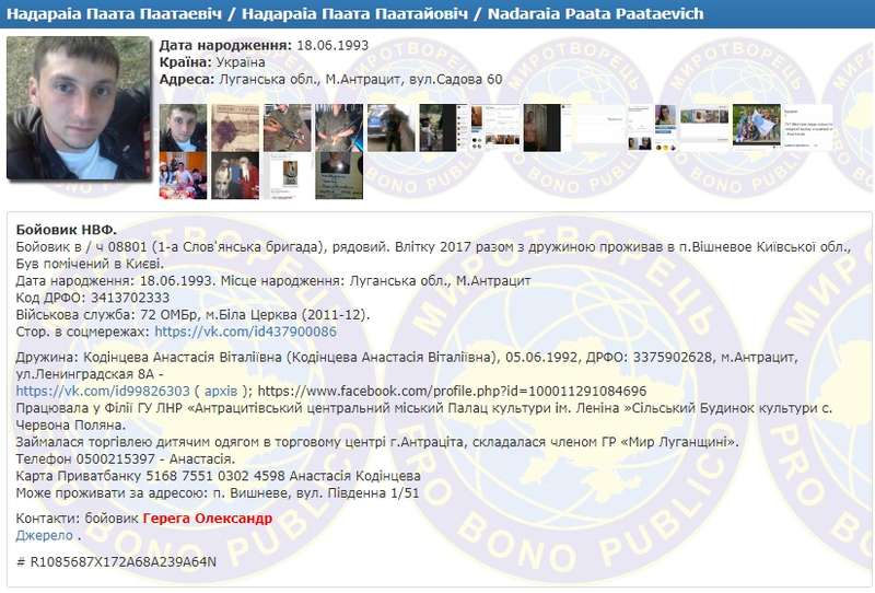 За даними “Миротворця”, Паата Надараіа – колишній бойовик в/ч 08801 (1-ша Слов’янська бригада “ЛНР”).