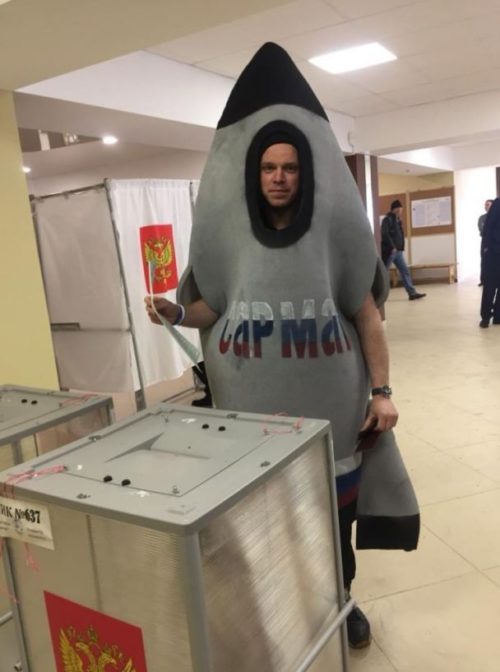 В Ленинградской области свой бюллетень в урну вбрасывал мужчина в костюме ракеты “Сармат”, которой недавно хвастался Путин.