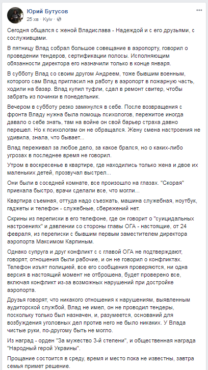 "Сегодня общался с женой Владислава - Надеждой и с его друзьями, с сослуживцами. В пятницу Влад собрал большое совещание в аэропорту, говорил о проведении тендеров, сертификации полосы. В субботу Влад со своим другом Андреем, тоже бывшим военным, которого сам Влад пригласил на работу в аэропорт в пожарную часть, ходили на базар", - рассказал в своем Facebook журналист Юрий Бутусов.