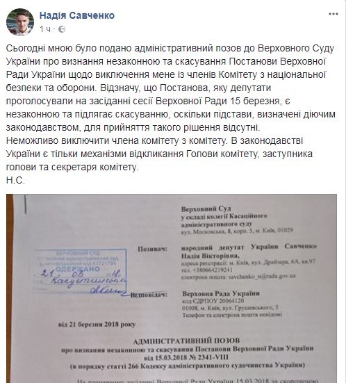 Народный депутат Надежда Савченко подала иск в Верховный Суд Украины, требуя признать незаконным постановление парламента об её исключении из Комитета национальной безопасности и обороны.