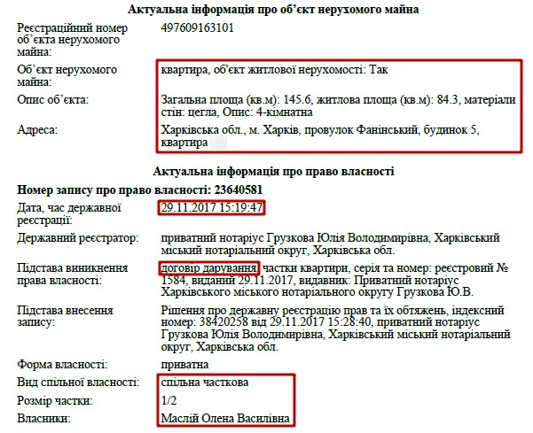 Елена Маслий вместе со своим братом-судьей является владельцем квартиры в центре Харькова. Свою долю этого жилья Елена получила на основании договора дарения в конце 2017 года. Площадь квартиры - 146 кв. м. и сегодня она стоит минимум 2,3 млн грн.