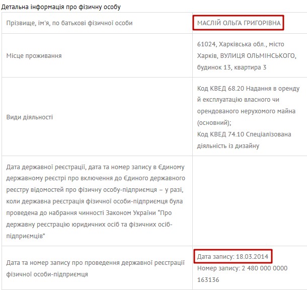 Мать прокурора - Ольга Григорьевна Маслий является владельцем 25% ООО "Фаворит 2014», который был основан не так давно, в 2013 году. Компания занимается производством резиновых изделий. Также в 2014 году Ольга Григорьевна зарегистрировалась как физическое лицо-предприниматель.