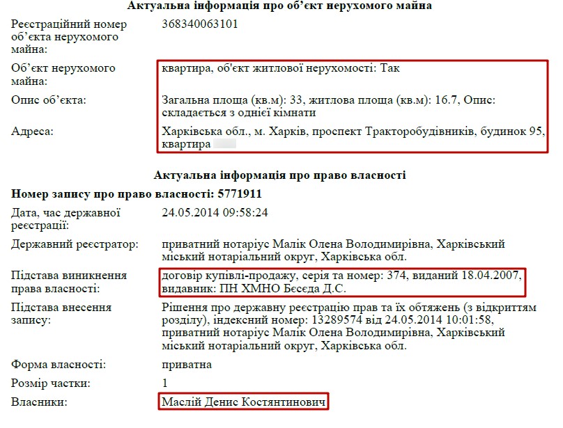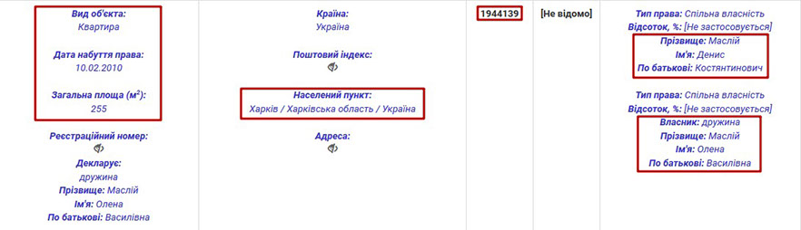 В непосредственной собственности Дениса Маслия с 2016 года есть дом и земля под ним в с. Протопоповка, что недалеко от Харькова. Общая площадь этого жилья 246 кв. м. Кроме этого, прокурор вместе с женой являются владельцами еще 6 соток земли в этом же селе.