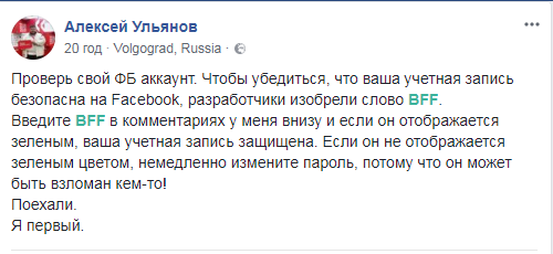 В социальной сети Facebook, которая ранее попала в скандал, связанный с рассекречиванием личных данных пользователей, активно распространяют ложный слух о том, что якобы можно проверить, защищен ли аккаунт, или срочно нужно менять пароль, вбив в комментарии слово "BFF".