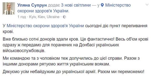 О необходимости в крови говорила о и.о. министра здравоохранения Ульяна Супрун. Более того, 13 октября 2016 года она лично сдала кровь под камеры СМИ и призвала всех неравнодушных сделать то же самое – чтобы «спасти жизнь украинским воинам».