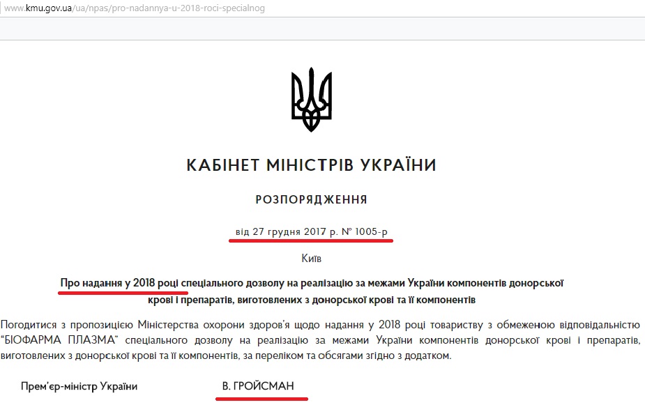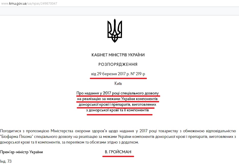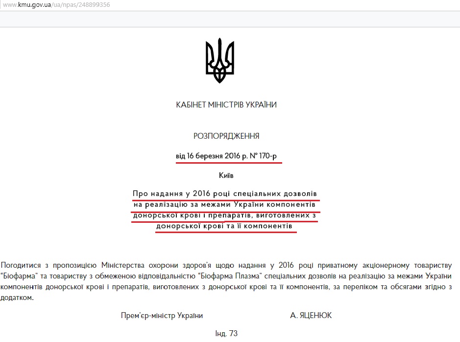 В это время украинская компания продолжала экспортировать препараты из плазмы донорской крови человека. Это стало возможным благодаря трем последующим распоряжениям Кабмина – одним за подписью Арсения Яценюка, двумя – за подписью Владимира Гройсмана.
