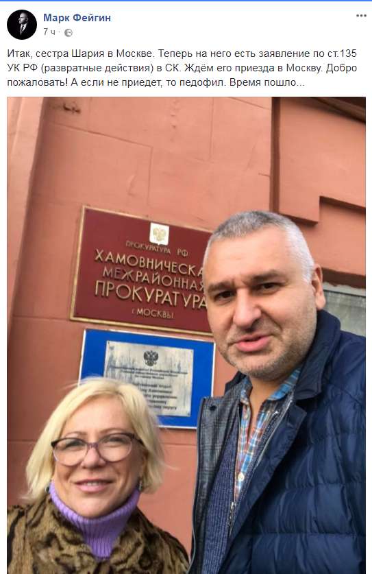 "Итак, сестра Шария в Москве. Теперь на него есть заявление по ст. 135 УК РФ (развратные действия) в СК. Ждем его приезда в Москву. Добро пожаловать! А если не приедет, то педофил. Время пошло", – сообщил на своей странице в Facebook адвокат Марк Фейгин.