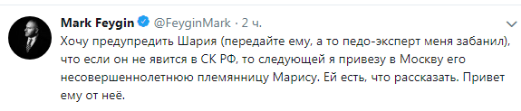 Хочу предупредить Шария (передайте ему, а то педо-эксперт меня забанил), что если он не явится в СК РФ, то следующей я привезу в Москву его несовершеннолетнюю племянницу Марису. Ей есть, что рассказать. Привет ему от нее", – написал он.