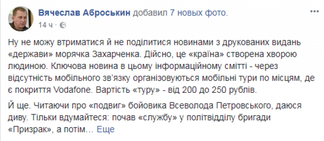 По словам Аброськина, многочисленные провалы боевиков «ДНР» находятся в прямой зависимости от глупого управления Александра Захарченко. Он подчеркнул: «Прочитав всю эту грязь, могу только сказать словами Уильяма Теккерея: „Мир это зеркало, и он возвращает каждому его собственное изображение“. Все, что сегодня происходит в Донецке, это полное отражение неуклюжести больного „морячка“ Захарченко».