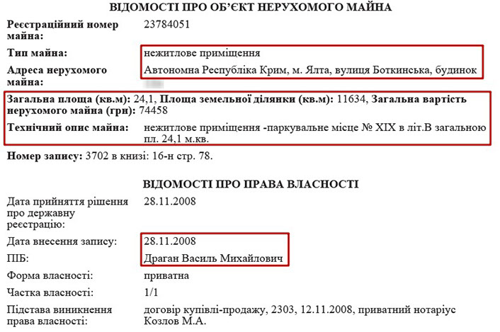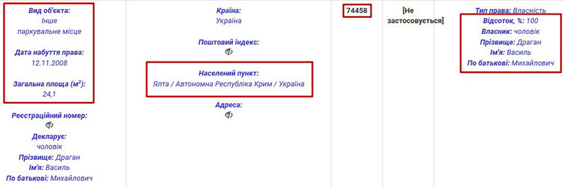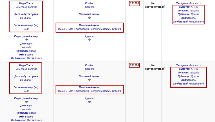 Решта майна Василя Михайловича розміщена в окупованому Криму. Зокрема він досі декларує земельні ділянки в смт. Сімеїз, що неподалік морського узбережжя. Більше того, на цих земельних ділянках розміщені будівлі, які жодного разу не фігурували у деклараціях прокурорського подружжя. Сьогодні, якщо вірити інформації із кадастрової карти, власниками цих ділянок є інші люди. Цікаво, що, як вказано в декларації, Василь Драган став власником землі у 2011 році, однак інформація про ці ділянки відсутня в декларації прокурора за 2013 рік. Також Василь Драган має паркомісце у Ялті .