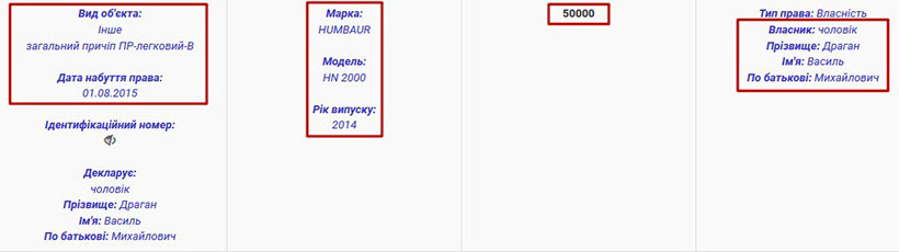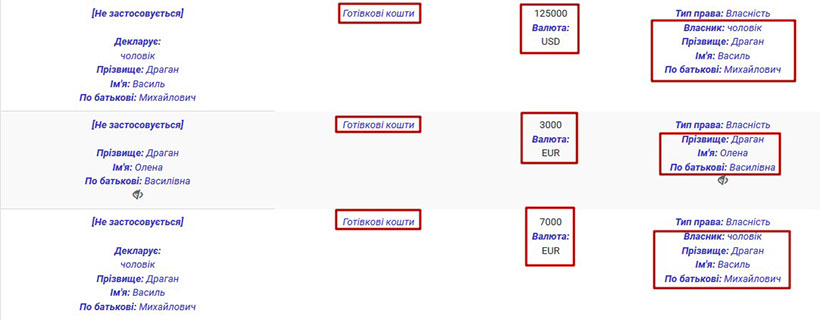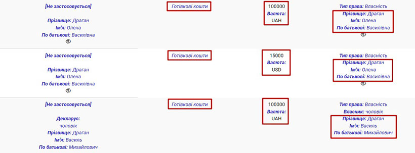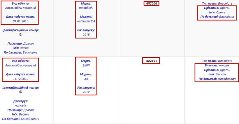 Щодо рухомого майна, то Олена Василівна є власником Mitsubishi Оutlander 2.4 2015 року випуску, вартістю 657 тис. грн. Василь Драган володіє BMW X5 2012 року, яку придбав за 822 тис. грн.