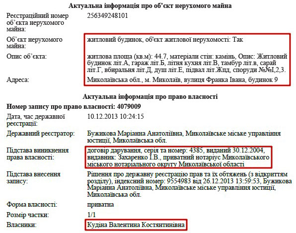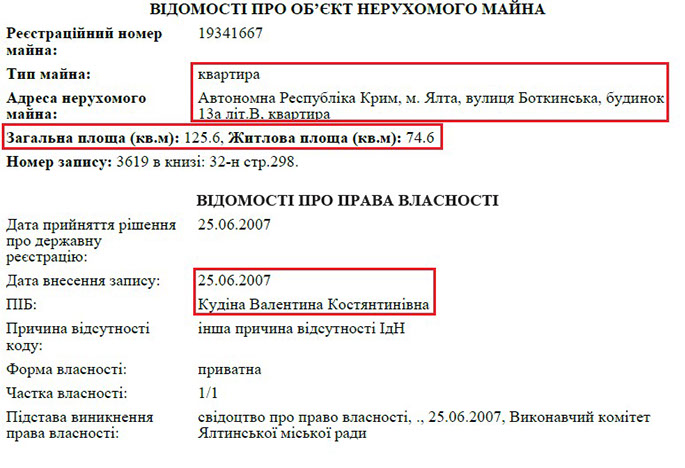Окремо розкажемо про майно родичів прокурорів. Зокрема, матір пані Олени – Валентина Костянтинівна Кудіна є власником елітної квартири в Києві, за адресою: Євгена Коновальця, 36-Е. Квартиру площею 106 кв. м. вона придбала у 2016 році. Сьогодні подібне житло коштує майже 3 млн грн. Також пані Валентина має будинок в Миколаєві, по сусідству із будинком своєї дочки та квартиру в Ялті.
