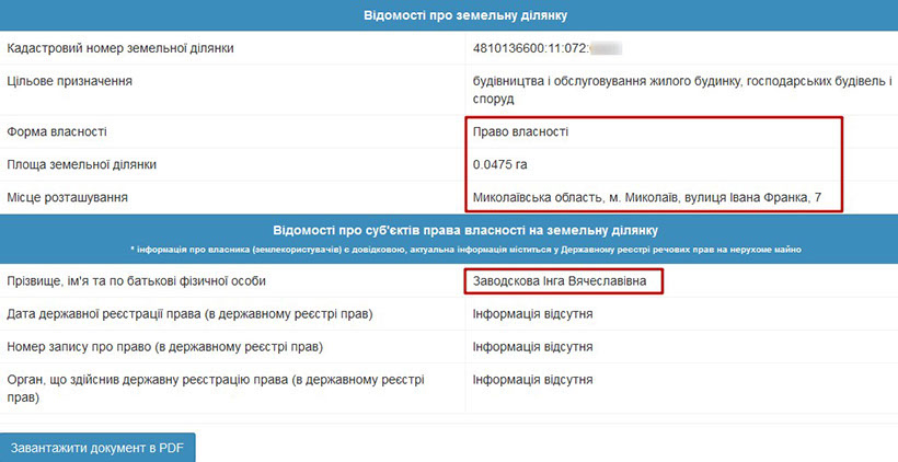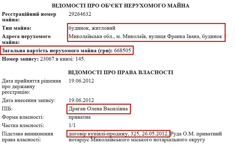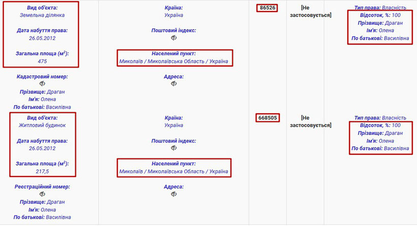 У безпосередній власності Олени Василівни є будинок в Миколаєві площею 217 кв. м., задекларованою вартістю 668 тис. грн, та земля під ним. Саме така інформація вказана в декларації чиновниці. Хоча на кадастровій карті можна побачити, що земля під будинком належить іншій особі – Інзі В’ячеславівні Заводсковій.