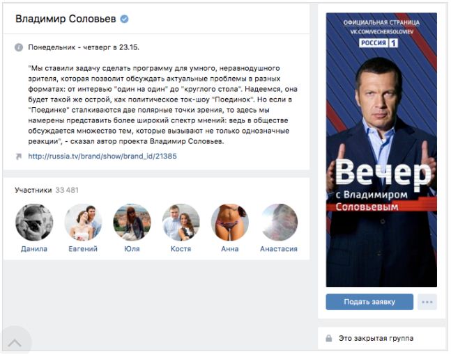 В ночь с 26 на 27 марта неизвестные взломали страницу телеведущего ВГТРК Владимира Соловьева и опубликовали в его сообществе необычный статус