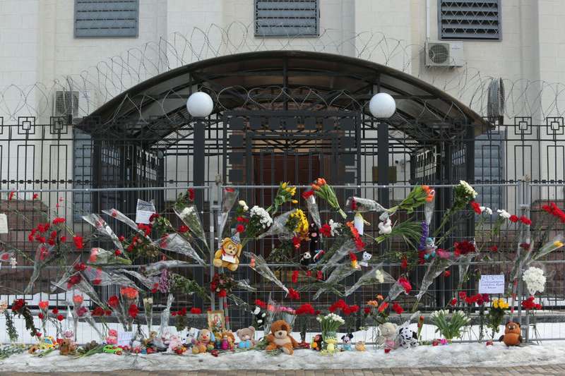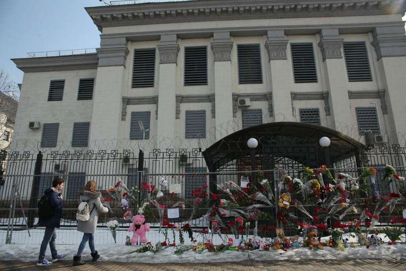 Киевляне и жители других городов Украины принесли цветы и детские игрушки к зданию посольства России в столице.