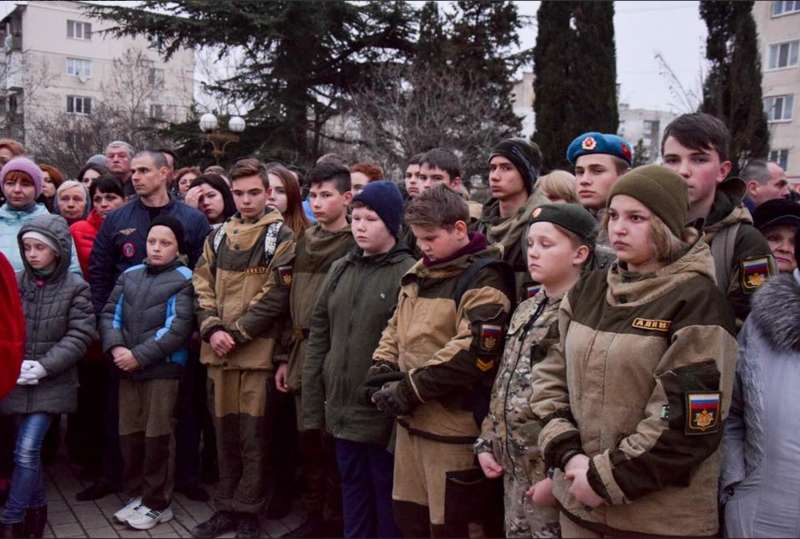 В оккупированном Россией Евпатории самозваные власти города созвали детей в камуфляже на день скорби, посвященного жертвам пожара в кемеровском торговом центре "Зимняя вишня".