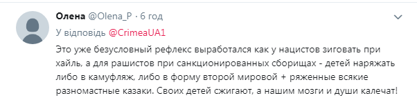 "Это уже безусловный рефлекс выработался как у нацистов зиговать при хайль, а для рашистов при санкционированных сборищах - детей наряжать либо в камуфляж, либо в форму второй мировой + ряженные всякие разномастные казаки. Своих детей сжигают, а нашим мозги и души калечат", – пояснили пользователи.