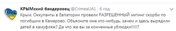 "Крым. Оккупанты в Евпатории провели разрешенный митинг скорби по погибшим в Кемерово. Объясните мне кто-нибудь, зачем и здесь вырядили детей в камуфляж? Да что же вы за конченные убл*дки", – написал в своей Twitter "КРЫМский бандеровец".