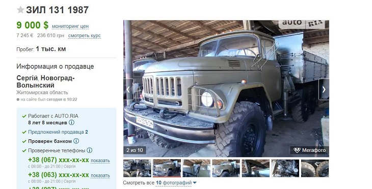 ЗИЛ-131 с киевскими номерами «АА 5016 СМ» также опубликован на сайтах Нацполиции и на сайте продажи авто. Объявление появилось в феврале, продавцы просят $9 тыс. «Авто 1987 года, фактически без использования. Новая резина, гаражное хранение, новый аккумулятор», — рекламируют авторы.