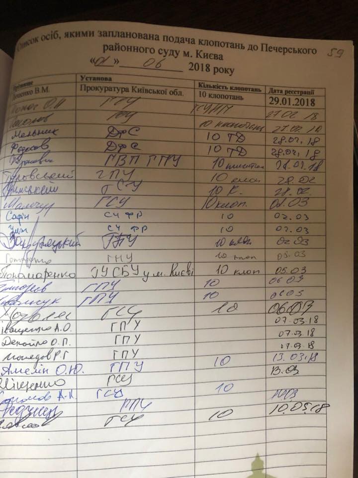 Глава ГПУ опубликовал фото, на котором, по его словам, показана запись очереди правоохранителей на право подать в Печерский райсуд Киева ходатайства, “которые, возможно, будут рассмотрены 25 июня”.