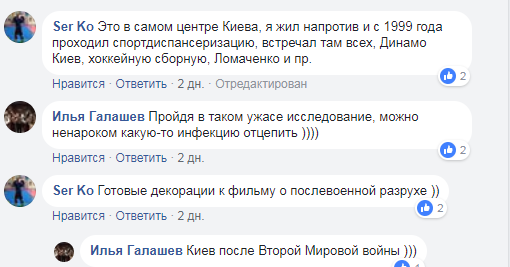 "Пройдя в таком ужасе исследование, можно ненароком какую-то инфекцию отцепить", "Готовые декорации к фильму о послевоенной разрухе", "Киев после Второй мировой войны", "Иллюстрация отношения государства к спорту", "Это просто дичь какая-то. Я в шоке!", "Готовимся к чемпионату мира", - написали они.