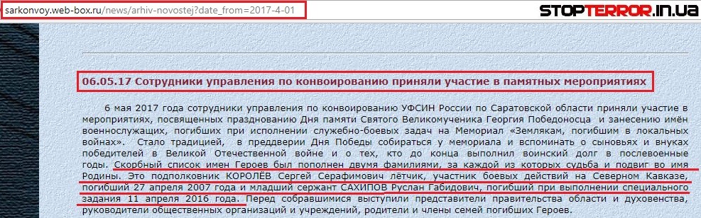 Подтверждением факта службы в ВС РФ является заметка о гибели младшего сержанта Сахипова, чью память почтили Сотрудники управления по конвоированию РФ.