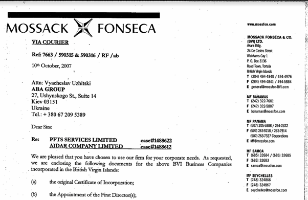 Часть этих документов попала в редакцию «Наших грошей». Из них мы узнали, что «Aidar» создавали за «Mossaсk Fonseсa», но руками киевского юриста Вячеслава Ужицкого. Он предоставлял все необходимые для основания компании копии документов и необходимую информацию. Ужицкий в «панамских бумагах» фигурирует как представитель компании «ABA Group», зарегистрированной, судя по документам, прямо у него в квартире.