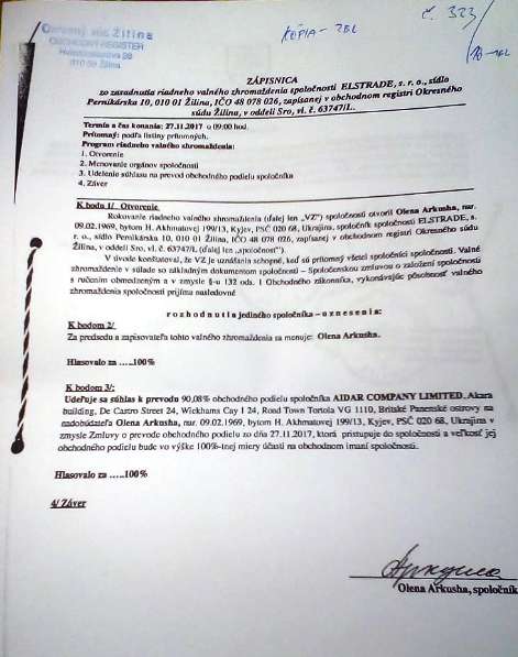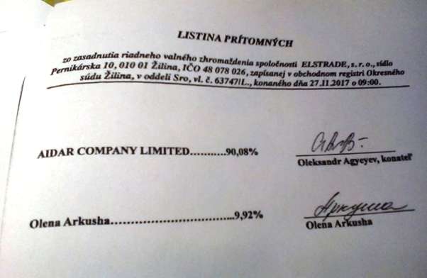 27 ноября 2017 года в Словакии акционеры «Elstrade sro» решили, что 90,08% доли совладельцев Aidar будут переведены на Елену Аркушу. Следовательно, величина доли Елены Аркуши возрастет до 100%.