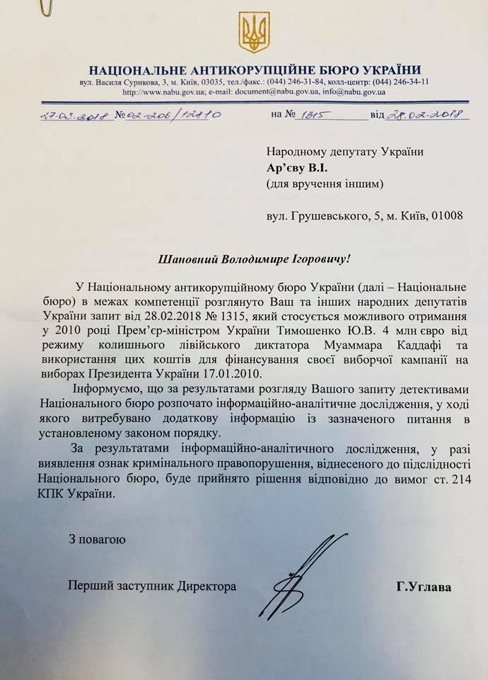 НАБУ начала проверку информации о финансировании Каддафи избирательной компании Тимошенко - Арьев