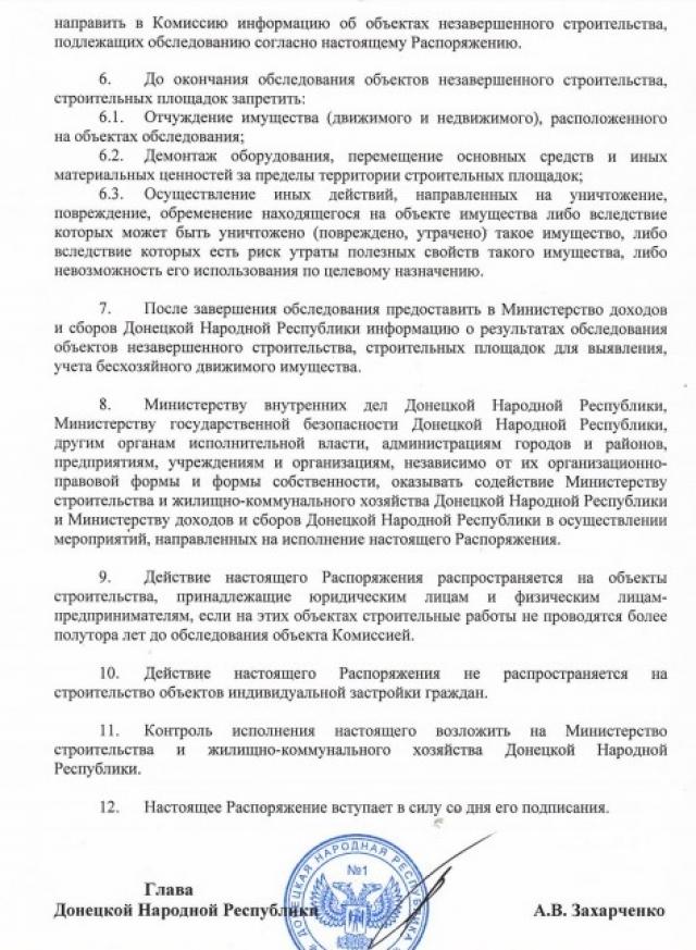 Отмечается, что «распоряжение» обязывает «администрации» оккупированных населенных пунктов подготовить и направить в «комиссию» информацию о недостроенных объектах и всем, что на них расположено.