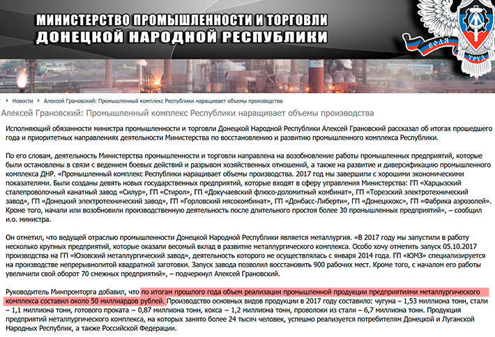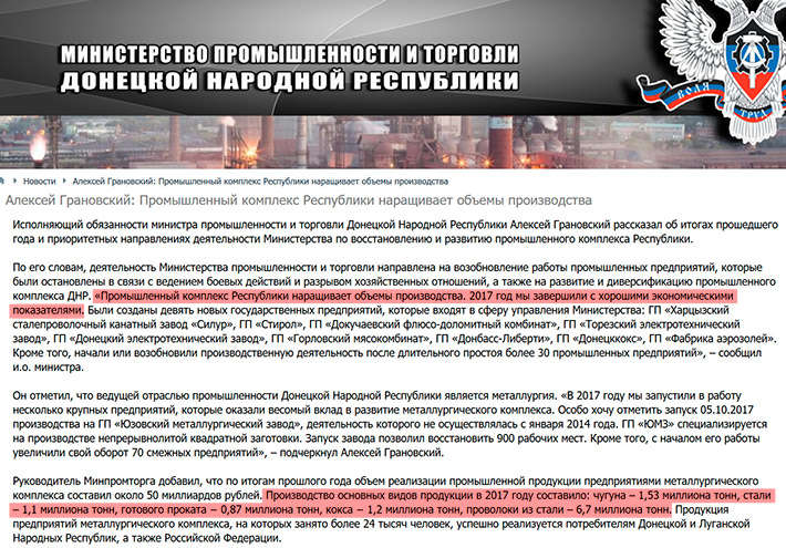 27 февраля так называемый «Министр» промышленности и торговли ДНР Алексей Грановский на сайте своего министерства заявил что «Промышленный комплекс Республики наращивает объемы производства. «2017 год мы завершили с хорошими экономическими показателями… Производство основных видов продукции в 2017 году составило: чугуна – 1,53 миллиона тонн, стали – 1,1 миллиона тонн, готового проката − 0,87 миллиона тонн, кокса − 1,2 миллиона тонн, проволоки из стали – 6,7 миллиона тонн» – сказал Грановский.