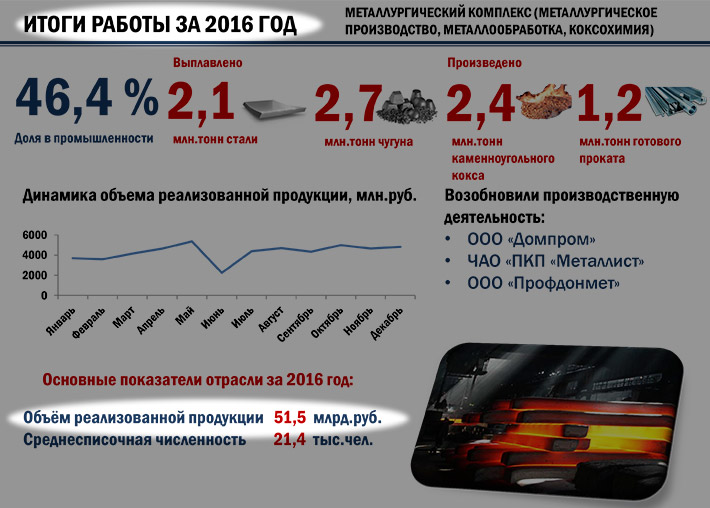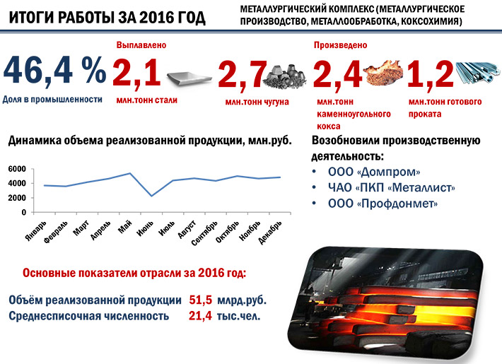 В 2016 году, по данным Министерства промышленности и торговли ДНР было выплавлено 2.1 млн. тон стали, 2,7 млн, тонн чугуна, 2.4 млн. тон кокса, 1.2 млн. тонн готового проката.