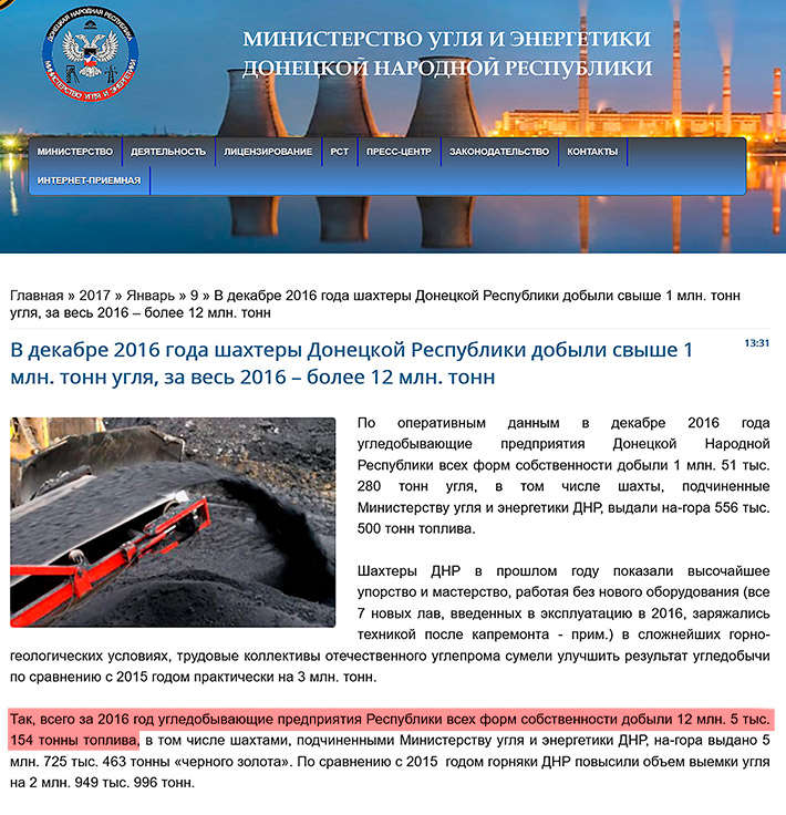 Согласно этой публикации на сайте «Министерства» угля и энергетики «ДНР» в 2016 году «угледобывающие предприятия Республики всех форм собственности добыли 12 млн. 5 тыс. 154 тонны топлива».