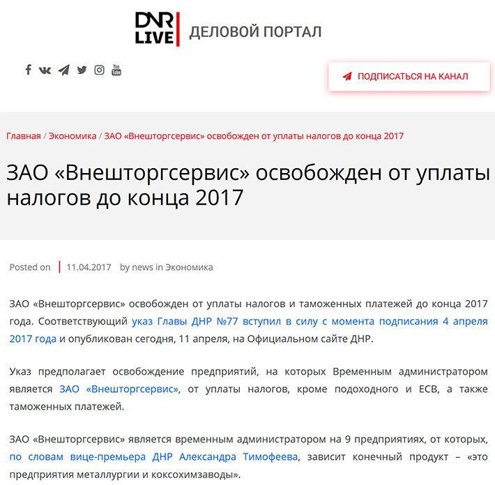 Впрочем, это, видимо, не единственная «победная» цифра, взятая главарями «ДНР» с потолка. Так, например, вице-премьер «ДНР» по кличке «Ташкент» заявлял о росте поступлений в бюджет республики. Да, такой рост был бы возможен, если бы действительно росла промышленность, но мы только что убедились, что никакого роста промышленности нет. Более того, металлургия, которая, как мы помним, составляет 46% всей промышленности ДНР, в 2017 году была фактически освобождена от уплаты налогов так называемой «республике». Потому что, все 9 предприятий металлургического комплекса – были переданы в так называемое «внешнее управление» ЗАО «Внешторгсервис». А 11 апреля 2017 года, «генералисимус» Захарченко своим указом освободил ЗАО «Внешторгсервис», от уплаты налогов, кроме подоходного, ЕСВ и таможенных платежей.