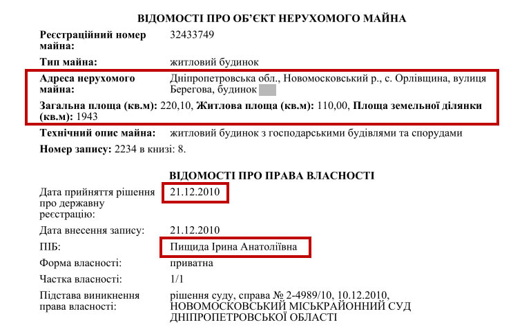 Дружина Миколи Пищиди – Ірина володіє будинком на 220 кв. м. у Дніпропетровській області. Право на нього вона набула у 2010 році і на той момент вартість цього майна становила 1 297 284 грн.