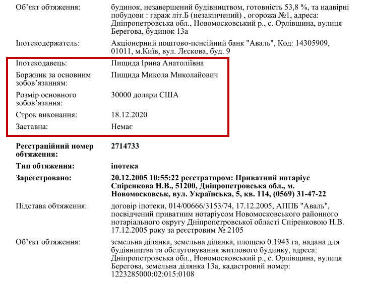 У 2005 році Микола Пищида взяв кредит у банку на суму 30 000 доларів із строком виплати до 2020 року. У зв’язку з цим земля і помешкання були передані в іпотеку. Але під час співбесіди суддя повідомив, що розрахувався з усіма зобов’язаннями ще в 2010-му.