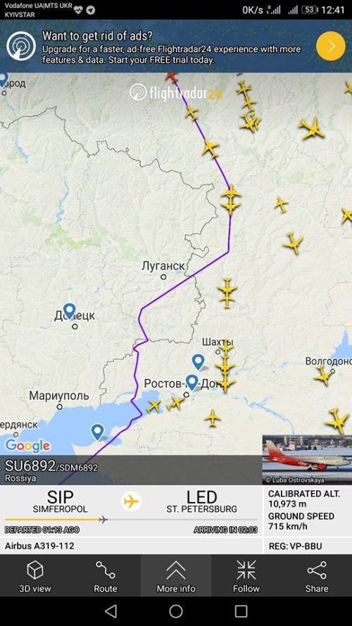 В результате самолет совершил авиарейс из Симферополя, пролетел через Россию и пропал над Донбассом