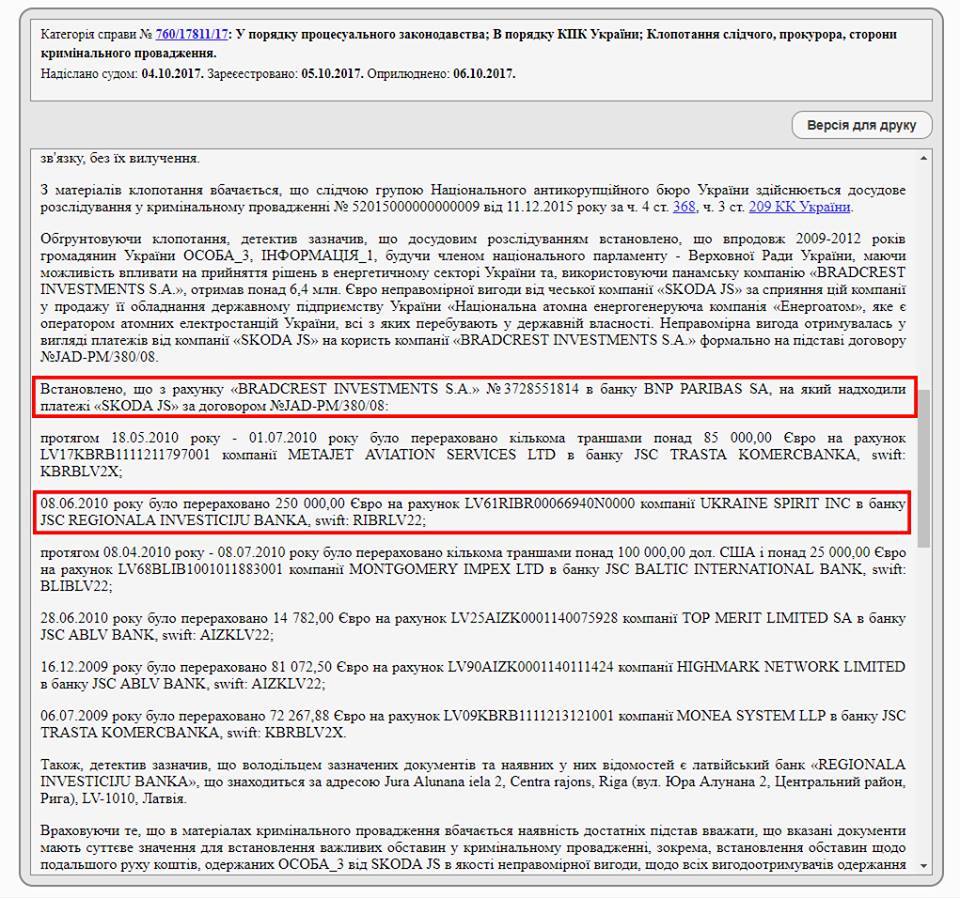 Нагадаємо, що за даними НАБУ, впродовж 2008-2012 років державний "Енергоатом" підписав кілька контрактів з чеською фірмою Škoda JS за завищеними цінами. Після чого чеська компанія переказувала на рахунки панамського офшору Bradcrest "відсотки" на загальну суму в 6,4 мільйона євро.