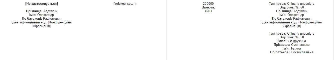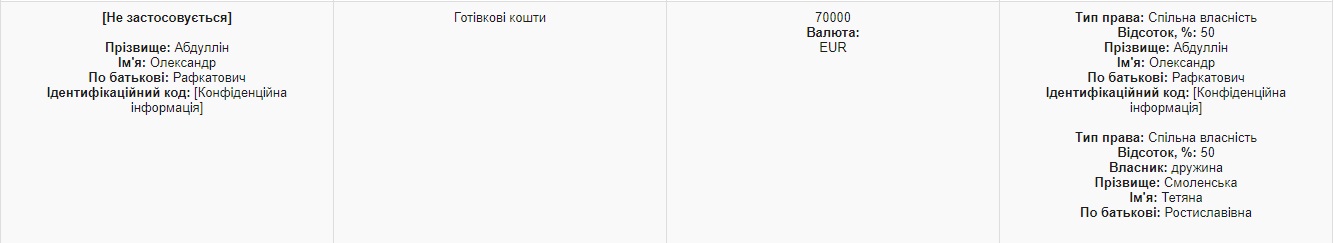 Олександр Абдуллін. Усю готівку депутат задекларував, як спільну з дружиною власність у відсотковому відношенні 50/50. “На руках” у нардепа: 375 тисяч доларів, 70 тисяч євро та 200 тисяч гривень.