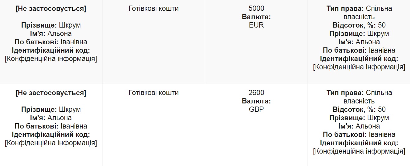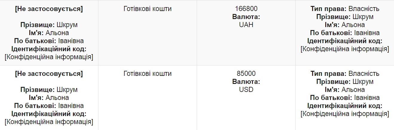 Альона Шкрум. Ні Шкрум, ні її чоловік не зберігають гроші в банках. При цьому у готівці депутат має 166,8 тисяч гривень і $85 тисяч.
