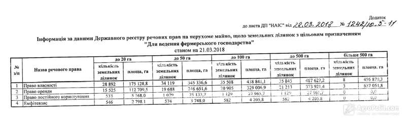 Аналізуючи офіційні дані Державного реєстру речових прав на нерухоме майно Мінюсту станом на 21 березня 2018 рокуможна сміло сказати: практично всі землі с/г призначення державної власності (а їх було більш ніж 10 млн га) у прямому підпорядкуванні держави уже ніколи не будуть! Все роздано, розділено, захоплено, взято в довготермінову та безстрокову оренду приватним с/г підприємствам, «фермерами», під ОСГ, в постійне користування міністерствам, установам та іншим різноманітним громадським структурам.