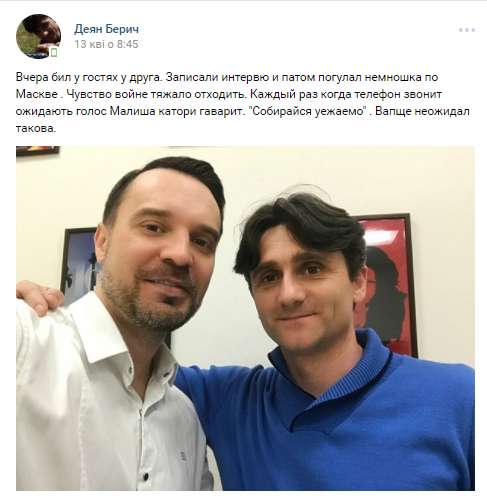 "Вчера был в гостях у друга. Записали интервью и потом погулял немножко по Москве. От чувства войны тяжело отходить. Каждый раз, когда звонит телефон, то ожидаю услышать голос "Малыша", который говорит: "Собирайся, уезжаем", — написал Берич на своей странице "Вконтакте".