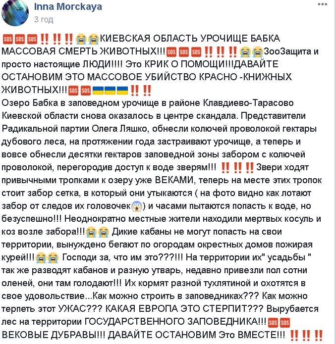 «Представители Радикальной партии Олега Ляшко, которые обнесли колючей проволокой гектары дубового леса, на протяжении года застраивают урочище, а теперь и вовсе обнесли десятки гектаров заповедной зоны забором с колючей проволокой, перегородив доступ к воде зверям!!!», — говорится в сообщении.
