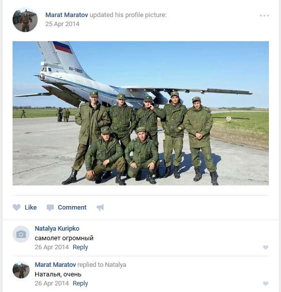 У одного из военнослужащих с медалью «За возвращение Крыма» — радиотелефониста-гранатомётчика отделения связи взвода связи 1 мотострелкового батальона Магомедова Марата Назрутдиновича — в альбоме также обнаружено фото в неуставной форме без знаков различия на фоне самолёта ИЛ-76МД. На другом снимке из его же альбома группа военнослужащих тоже стоит перед ИЛ-76МД, и на этом самолёте прекрасно виден бортовой номер — RA-78805: