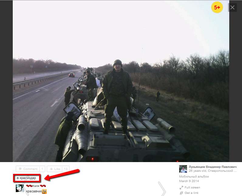 Одно из них мы нашли у того же Лукьянцева. На нём он стоит опять же на БТР-82А. Фото называется «в Краснодар» и добавлено оно 9 марта 2014 г.